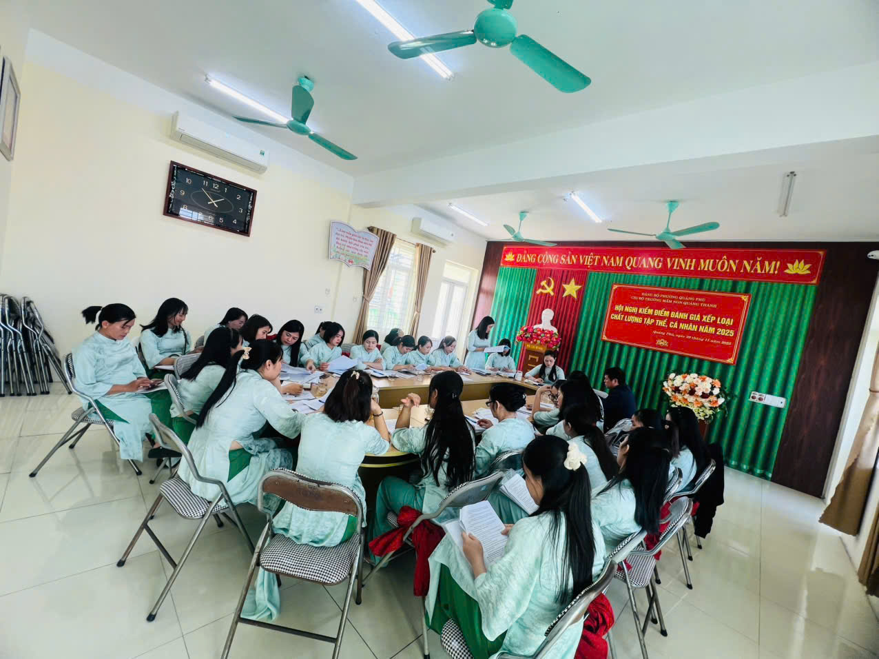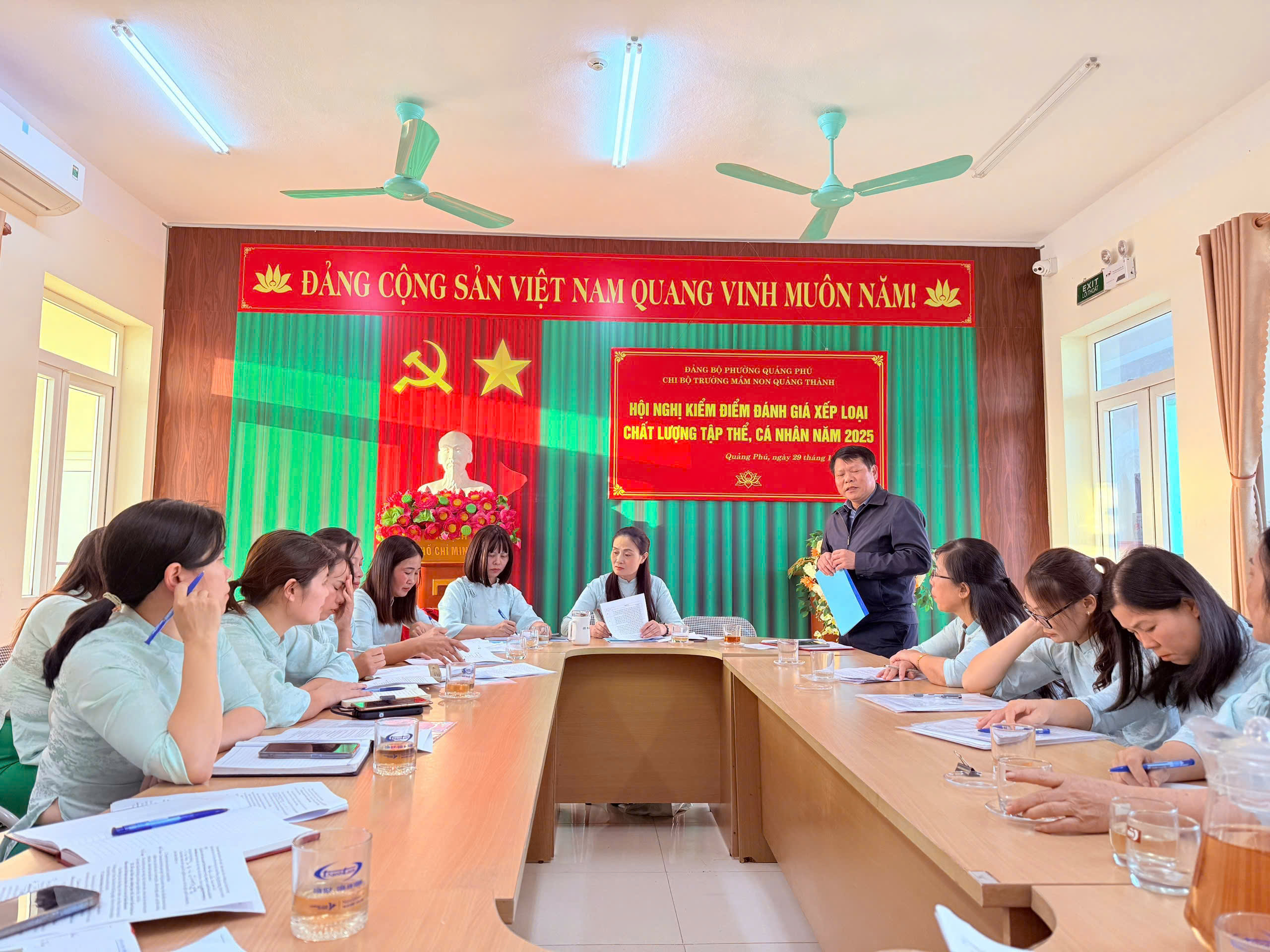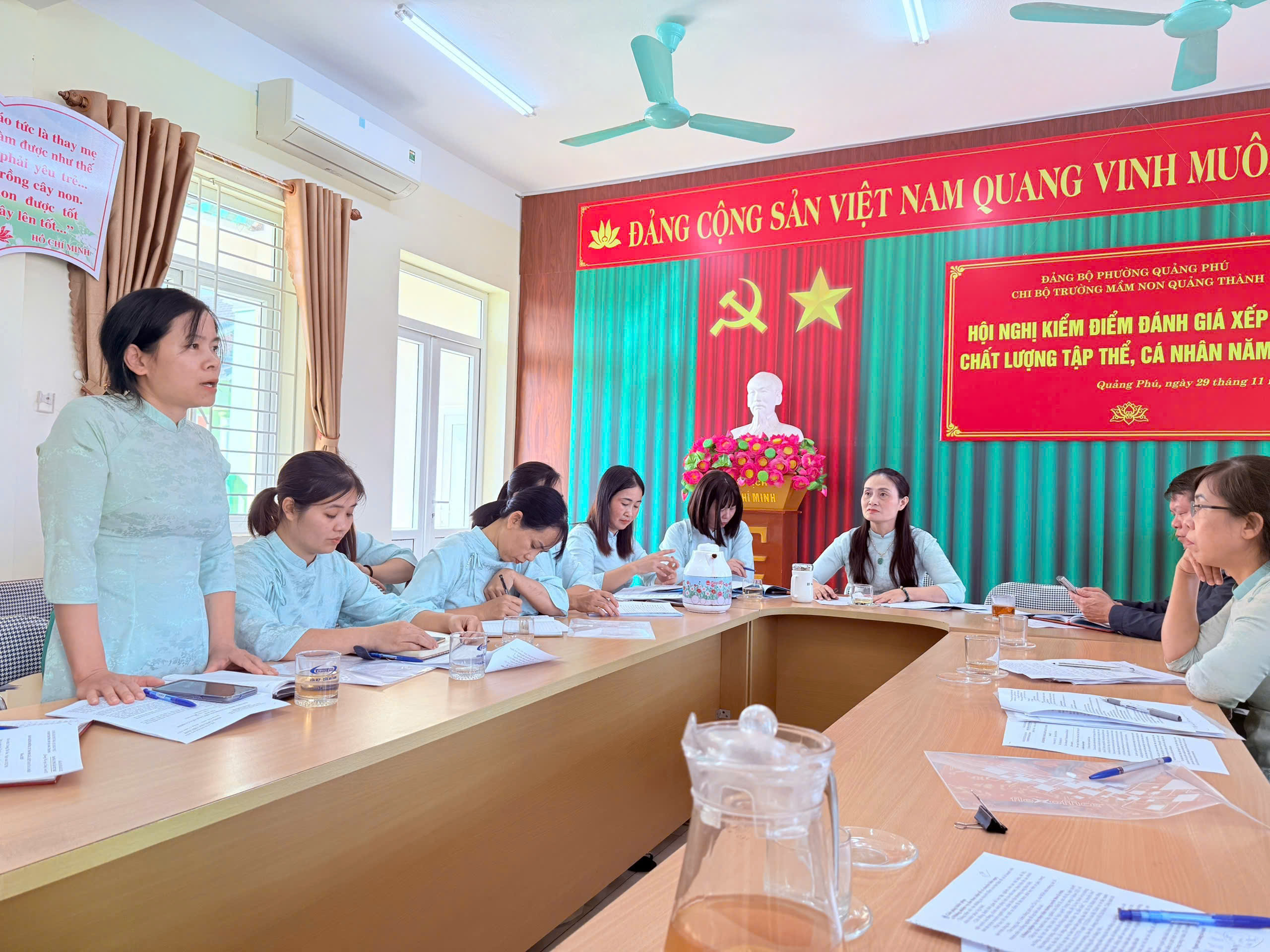 Chi bộ Trường Mầm non Quảng Thành đã tổ chức Hội nghị kiểm điểm, đánh giá và xếp loại chất lượng đảng viên năm 2025. Hội nghị diễn ra vào hồi 13h30 phút ngày 29/11/2025 nhằm tổng kết đánh giá kết quả thực hiện nhiệm vụ của đảng viên trong chi bộ.